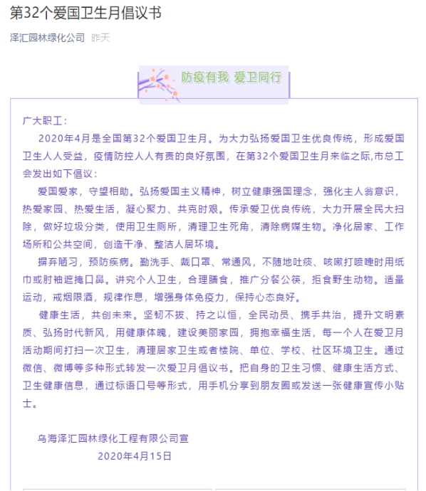 2020年4月是全國(guó)第32個(gè)愛國(guó)衛(wèi)生月。4月15日下午,澤匯園林公司組織廣大職工開展以“防疫有我、愛衛(wèi)同行”為主題的志愿者活動(dòng)?;顒?dòng)在烏海湖一號(hào)碼頭舉行,公司總經(jīng)理王海軍、副總經(jīng)理康莉萍參加了本次活動(dòng)。