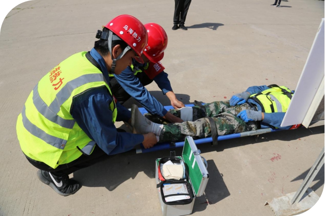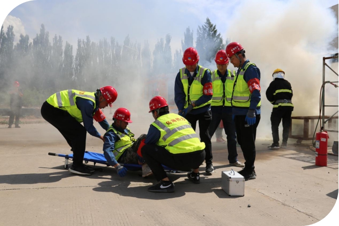 本次演練模擬供熱管網(wǎng)施工現(xiàn)場情景,由于破拆聚氨酯保溫后未進(jìn)行及時(shí)清理現(xiàn)場,聚氨酯保溫層易燃導(dǎo)致發(fā)生火災(zāi),施工人員在慌忙撤離現(xiàn)場時(shí)腿部腳踝扭傷,施工人員使用現(xiàn)場滅火器進(jìn)行滅火,火勢無法控制,通知救援組救援,救援組趕到后滅火,對受傷人員進(jìn)行簡單治療的過程。