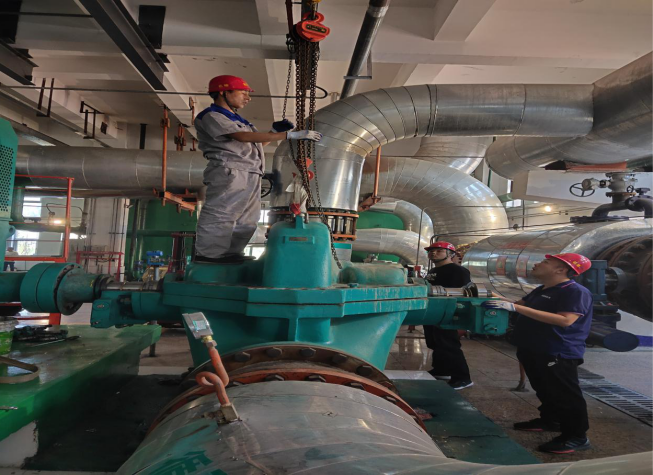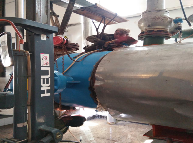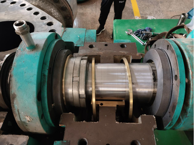 1#循環(huán)泵可以說是隔壓站之重器,2016年安裝投入使用,已連續(xù)穩(wěn)定運行3個采暖季。額定流量5000T/H,工作揚程80米,非嚴寒期單臺泵運行就可以滿足1000萬㎡的供熱任務(wù)。因連續(xù)工作水泵機械密封磨損老化出現(xiàn)漏水,2020年隔壓站將1#循環(huán)泵的維修列為重點檢修工程。8月31日,邀請水泵維修專業(yè)技術(shù)人員到場在隔壓站機修人員的配合下對水泵進行維修。