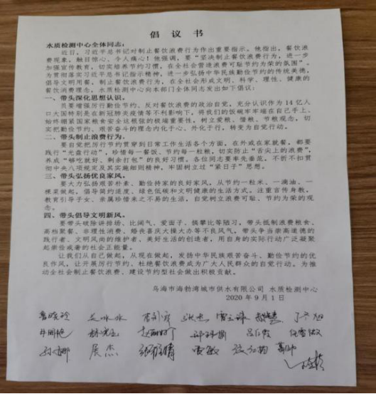 為深入貫徹落實習近平總書記的重要指示精神,示范帶動公司形成“厲行節(jié)約、反對浪費”的良好風尚。海勃灣城市供水公司水質(zhì)檢測中心發(fā)起了“厲行節(jié)儉,杜絕浪費”倡議書。倡議書主要內(nèi)容是從現(xiàn)在開始,從生活習慣做起,在細微之中爭做勤儉節(jié)約的傳播者、踐行者和示范者,用實際行動展現(xiàn)出理性消費,節(jié)約勤儉的良好社會風尚,共同為建設文明、和諧、環(huán)保的社會環(huán)境作出應有的貢獻!