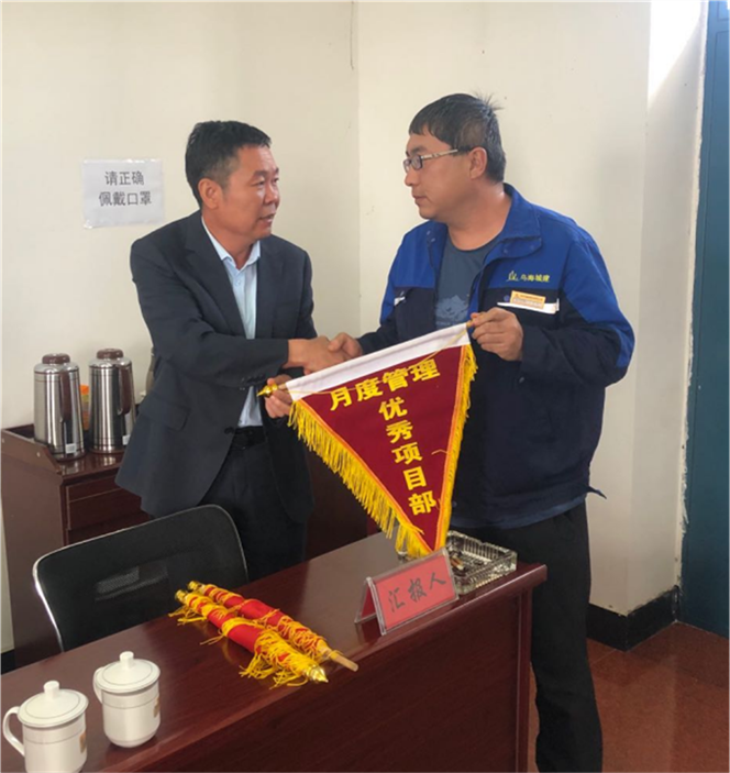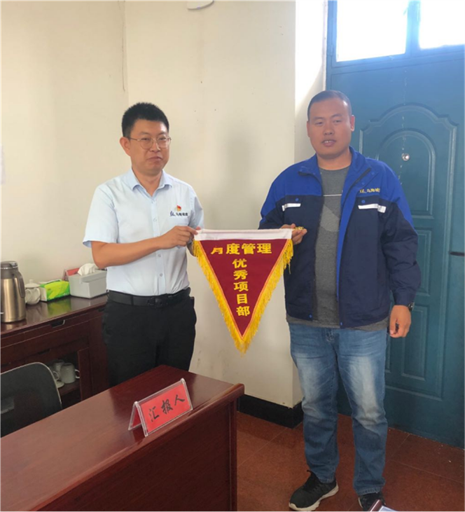 城建公司總經理袁藝為第一名頒發(fā)《月度管理優(yōu)秀項目部》榮譽稱號(圖左城建公司總經理袁藝;圖右項目經理方志軍)