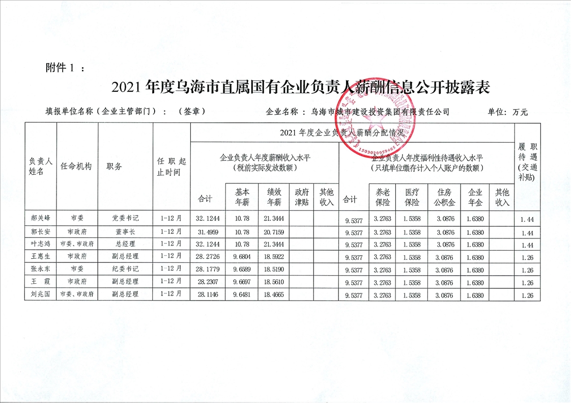 烏海市城市建設(shè)投資集團(tuán)有限責(zé)任公司2021年度企業(yè)負(fù)責(zé)人薪酬信息公開披露表