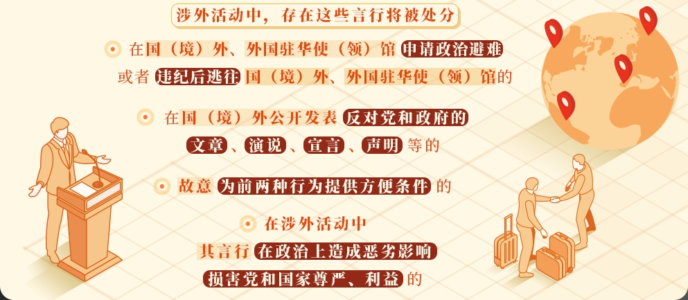 涉外活動關(guān)系黨和國家的尊嚴和榮譽,具有很強的政治性。《中國共產(chǎn)黨紀律處分條例》第七十二條、七十三條對涉外活動中存在有政治問題的言行作了處分規(guī)定,主要有以下幾類:1.在國(境)外、外國駐華使(領(lǐng))館申請政治避難,或者違紀后逃往國(境)外、外國駐華使(領(lǐng))館的,給予開除黨籍處分。所謂“申請政治避難”,一般指黨員以所謂“政治原因”為借口,逃往國(境)外或外國駐華使(領(lǐng))館,申請取得居留權(quán)并居住在國(境)外或者外國駐華使(領(lǐng))館?!斑`紀后逃往國(境)外、外國駐華使(領(lǐng))館的”,一般指違紀黨員為逃避紀律處分,逃往國(境)外、外國駐華使(領(lǐng))館。無論是向外國申請政治避難,還是違紀后逃往國(境)外,都表明該黨員已徹底背叛黨的事業(yè),喪失了共產(chǎn)黨員條件,應(yīng)當給予開除黨籍處分。2.在國(境)外公開發(fā)表反對黨和政府的文章、演說、宣言、聲明等的,給予開除黨籍處分。黨員在國(境)外公開發(fā)表反對黨和政府的言論,同樣表明其已徹底背叛了黨的事業(yè),喪失了共產(chǎn)主義信仰和共產(chǎn)黨員應(yīng)具備的條件,應(yīng)當受到最嚴厲的紀律處分。3.故意為前兩種行為提供方便條件的,給予留黨察看或者開除黨籍處分?!疤峁┓奖銞l件”,主要指為申請政治避難、外逃或者在國(境)外公開發(fā)表反動言論等提供各種有利條件,如為其開具證明、代辦護照簽證、幫助購買車船機票、提供經(jīng)濟幫助、提供落腳點、提供發(fā)表反動言論的平臺,等等。4.在涉外活動中,其言行在政治上造成惡劣影響,損害黨和國家尊嚴、利益的,給予撤銷黨內(nèi)職務(wù)或者留黨察看處分;情節(jié)嚴重的,給予開除黨籍處分。此類違紀行為包括兩個條件:一是該行為發(fā)生在涉外活動中;二是在政治上造成惡劣影響,損害黨和國家尊嚴、利益。無論什么時候,黨員干部都要切實增強政治敏銳性,在涉外活動中以良好精神風貌和舉止言行維護黨和國家形象,堅決防范有政治問題的言行。