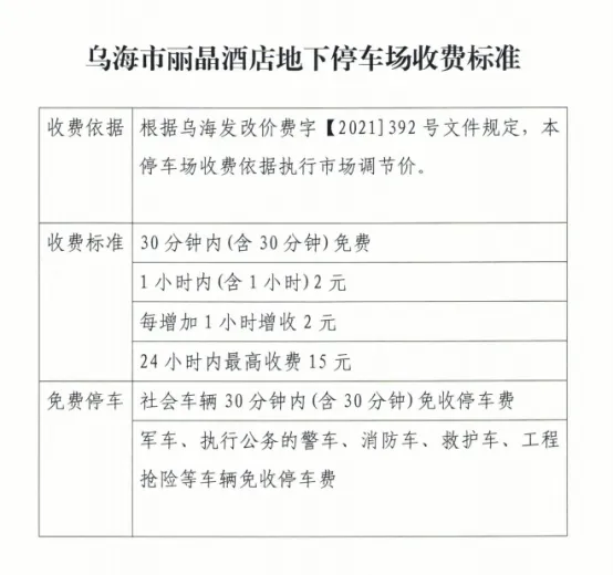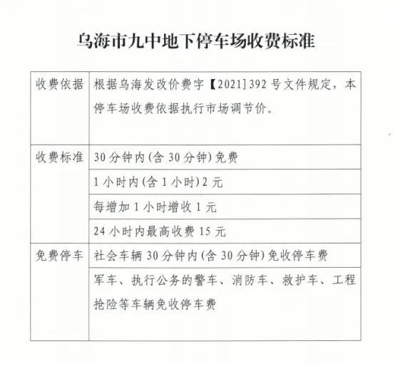 為緩解地面停車壓力,引導車輛有序停放,烏海市濱河九中地下停車場與麗晶國際酒店地下停車場已完成智能化升級改造。2024年7月25日經(jīng)海勃灣區(qū)城市管理綜合執(zhí)法局批準,兩個停車場于近期正式開展停車收費管理,收費標準見下表: