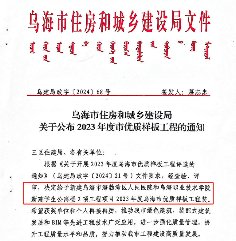 近日,烏海市住房和城鄉(xiāng)建設(shè)局發(fā)布了《關(guān)于公布2023年度市優(yōu)質(zhì)樣板工程的通知》名單,由城建公司承建的烏海市職業(yè)技術(shù)學(xué)院新建學(xué)生公寓樓項(xiàng)目榮獲2023年度烏海市優(yōu)質(zhì)樣板工程獎。