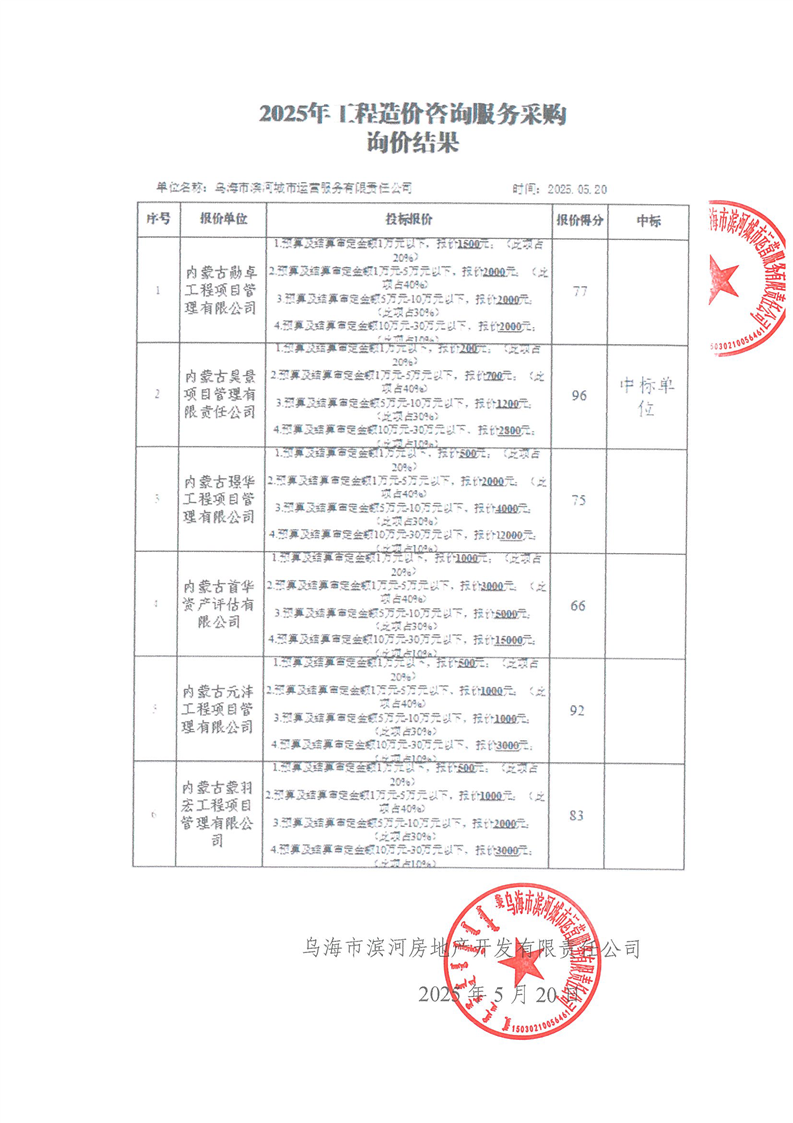 烏海市濱河城市運(yùn)營(yíng)服務(wù)有限責(zé)任公司2025年工程造價(jià)咨詢服務(wù)采購(gòu)中標(biāo)(成交)人公示