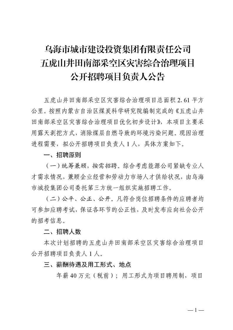 烏海市城市建設(shè)投資集團(tuán)有限責(zé)任公司五虎山井田南部采空區(qū)災(zāi)害綜合治理項目公開招聘項目負(fù)責(zé)人公告