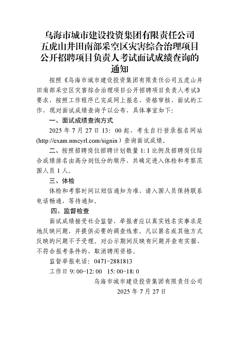 烏海市城市建設(shè)投資集團(tuán)有限責(zé)任公司五虎山井田南部采空區(qū)災(zāi)害綜合治理項(xiàng)目公開招聘項(xiàng)目負(fù)責(zé)人考試面試成績查詢的通知