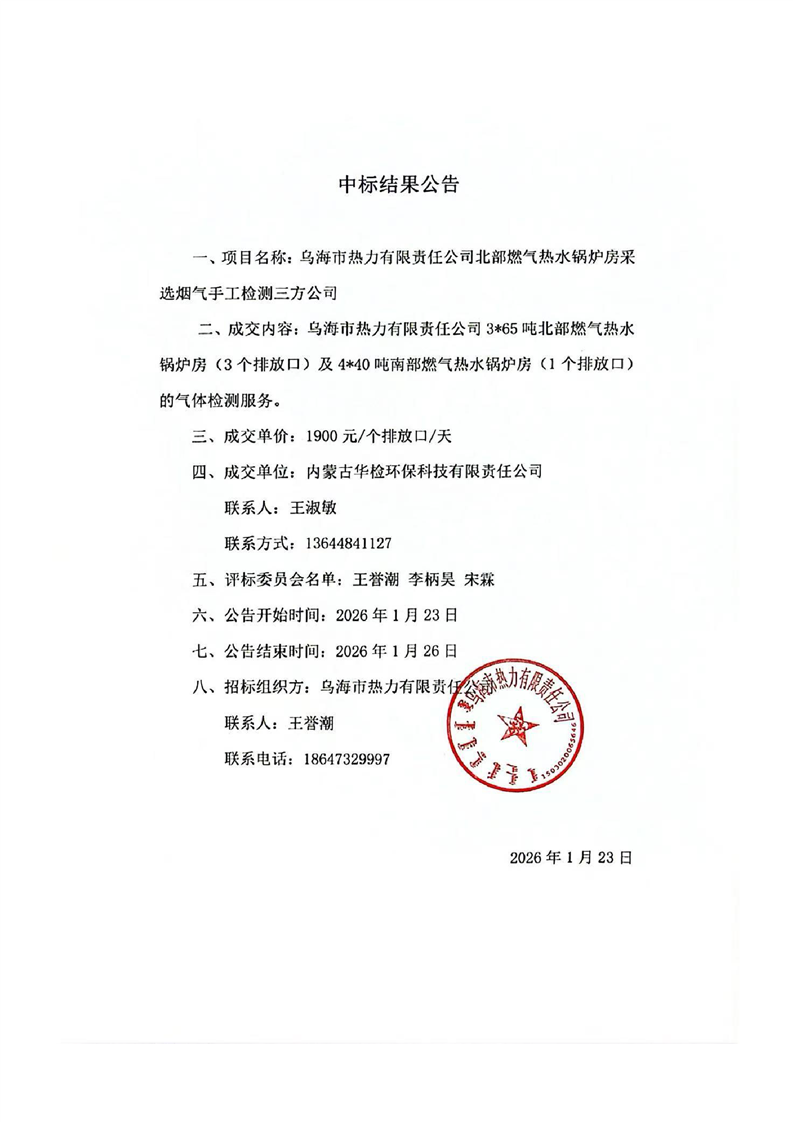 烏海市熱力有限責(zé)任公司北部燃?xì)鉄崴仩t房采選煙氣手工檢測(cè)三方公司服務(wù)項(xiàng)目中標(biāo)結(jié)果公告