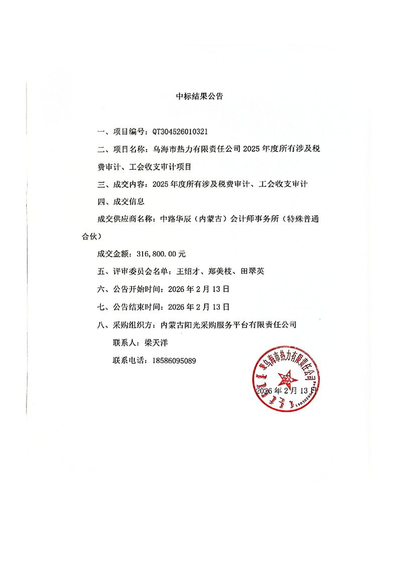 - 2026-02-25烏海市熱力有限責任公司車輛維修保養(yǎng)服務(wù)采購成交結(jié)果公告