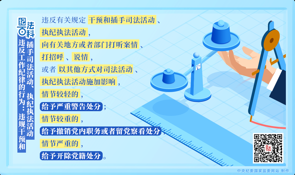 《中國共產黨紀律處分條例》第一百四十二條規(guī)定,違反有關規(guī)定干預和插手司法活動、執(zhí)紀執(zhí)法活動,向有關地方或者部門打聽案情、打招呼、說情,或者以其他方式對司法活動、執(zhí)紀執(zhí)法活動施加影響的,給予相應處分。